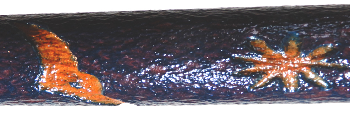 Die Oberflächenschicht ist blaurot gesprenkelt,